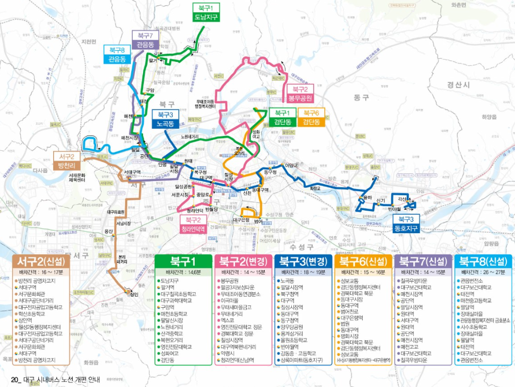 - 신설: 20개 노선 (직행 2개, 급행 3개, 간선 6개, 지선 9개)