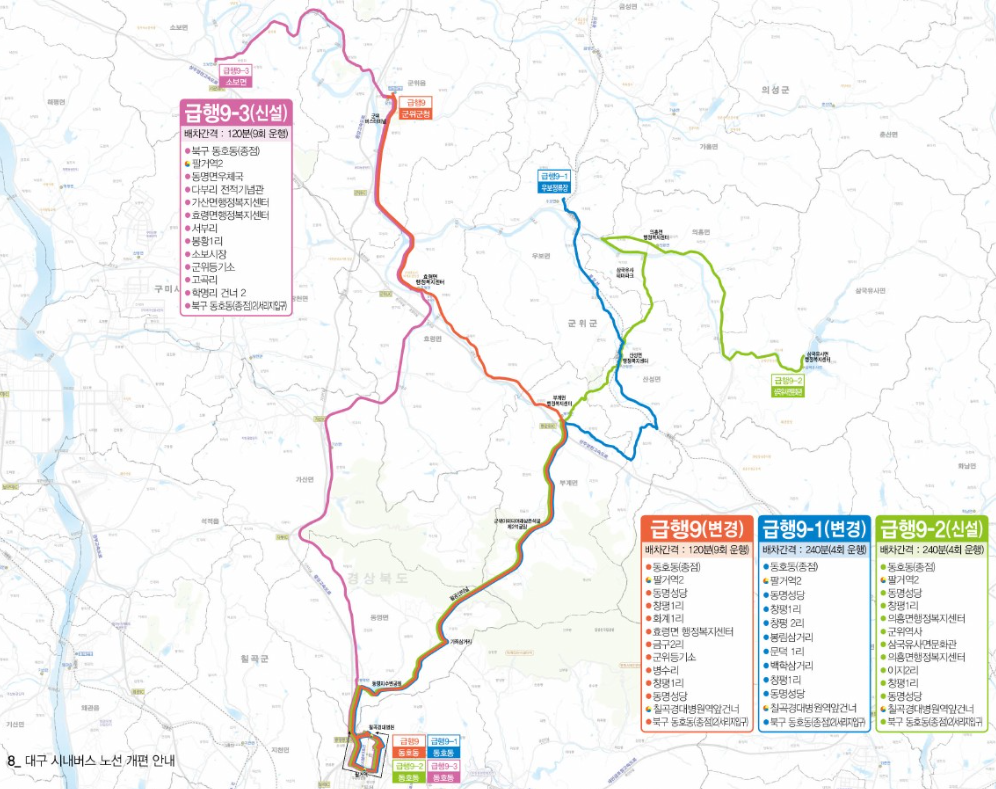 - 군위 연결 노선: 급행9-1번, 9-2번, 9-3번